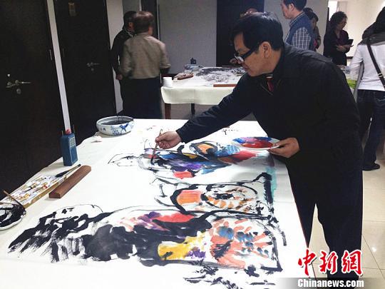 北京台湾艺术交流座谈会10月31日举办,两岸艺术家交流经验,现场挥毫泼墨。图为台湾艺术家现场作画。曾鼐摄