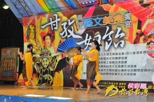 本场演出除了四川民族歌舞团带去的节目之外,台湾同胞也上台进行了声乐演奏、舞蹈等表演,两岸同胞同乐。而演出场地一圈,还有数十个台湾美食大排档,当地市民除了可以欣赏文艺表演,也还可以品尝到当地美食。