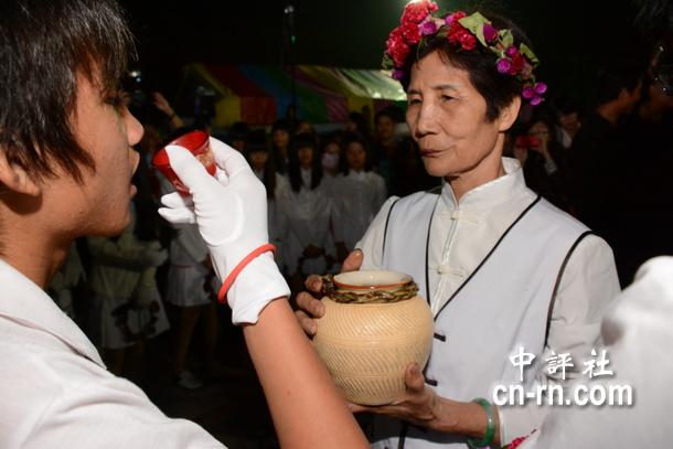 台南“头社夜祭”牵曲,参与的部落少中青三代,都要饮下念咒祈福过的水酒。(中评社 赵家麟摄)