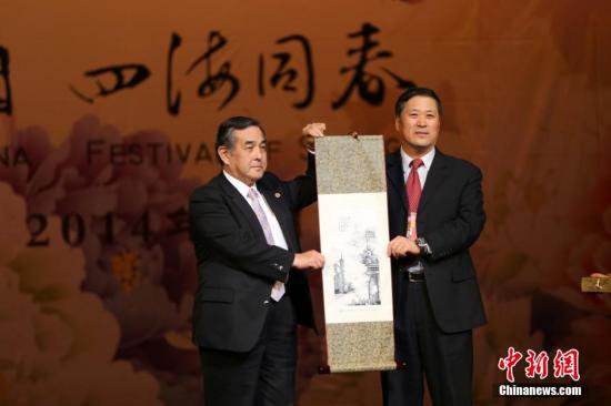 2月9日晚,2014年“文化中国四海同春”亚洲艺术团在东京北千住1010剧场举行了首演。“文化中国 四海同春”是中国国务院侨办自2009年春节开始打造的春节系列文化品牌活动。本次亚洲艺术团共在马来西亚,日本和韩国进行6场演出。图为亚洲团团长、暨南大学校长胡军向东京华侨总会会长廖雅彦赠送纪念品。中新社发 高越 摄