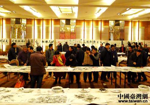 活动现场,书画名家激情挥墨,为本届书画展创作参展作品。张剑波先生创作、赵振川题跋的丈二尺的山水画《黄河颂歌》,寓意“母亲养育情,海峡两岸颂,汇聚正能量,实现中国梦”,在现场引起强烈震动,把活动推向高潮。