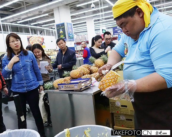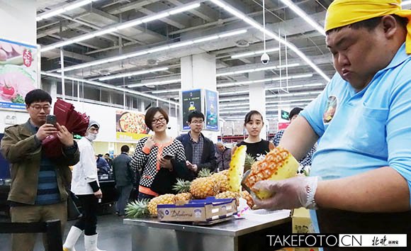 2014年4月2日 来自台湾的金牌快刀手林志龙蝉联10多年台湾削凤梨冠军,曾经创造6秒钟削一个凤梨的纪录。昨天,林志龙在沃尔玛山姆会员店内秀他的刀法。