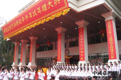 3月28日,东莞台商子弟学校举办甲午年成年礼大典。典礼过程依据古代周礼中士冠礼、士相见礼与相饮酒礼之精神而设。在经过佩冠礼等仪式后,共有190名台商子弟授冠成年。此次成年礼活动除传承中华文化古礼,让学生意识到成年负责的过程之外,更不断创新,融入感恩教育与生活教育,对于海峡两岸(粤台)中等教育论坛主题来说同样是一个最好的范例。(中国台湾网、东莞市台办联合报道)