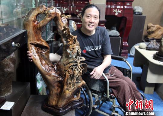 台湾轮椅上的雕刻家林正发和他的马年新作“春意嫣然”。