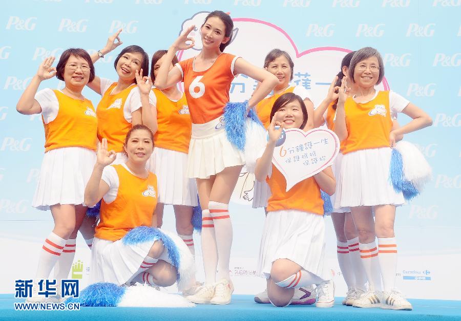 4月19日,林志玲(中)参加拉拉队表演宣传妇科癌症防治。当日,台湾艺人林志玲在台北市出席“6分钟护一生”妇科癌症防治宣传活动。林志玲呼吁女性朋友响应“6分钟护一生”的号召,每年定期做乳腺癌、子宫癌、卵巢癌等妇科癌症筛检,提早发现提早治疗,幸福健康地生活。新华社发