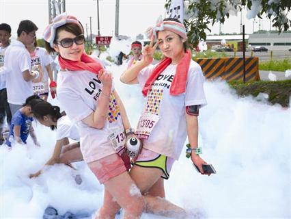 另终点站旁还有个泡泡舞台区,意犹未尽的跑者可在泡沫里尽情跳舞、翻滚。主办单位说,使用的染剂是可食用等级,泡泡也都是可生物分解,容易清理也安全。