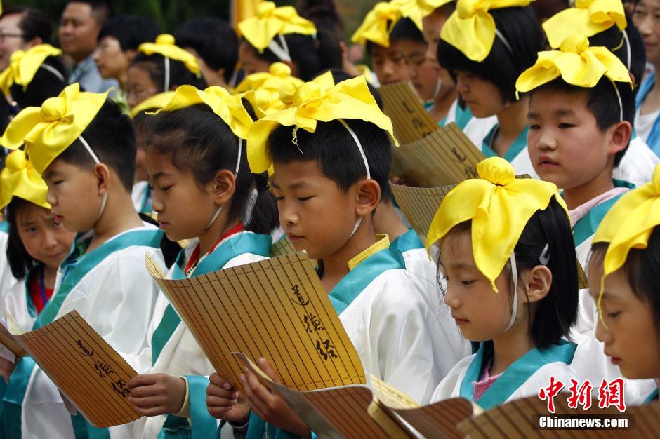 6月1日,儿童节,河南老君山,百名儿童身穿汉服共颂《道德经》和《乡愁》。台湾湾诗人余光中,听百名儿童齐声吟诵有他创作的感人诗作《乡愁》。中新社发 王中举 摄