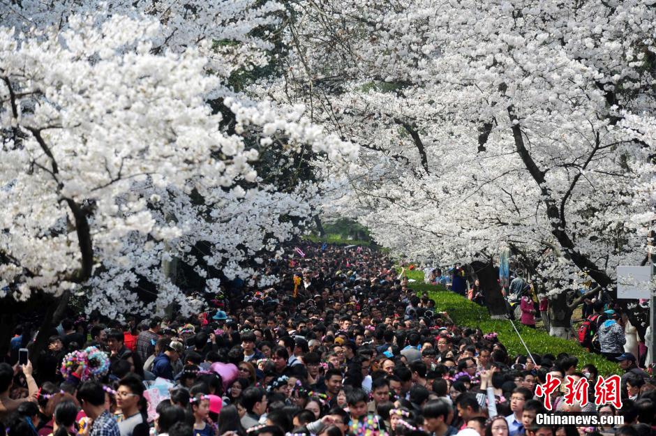 3月21日,武大樱花盛开游客如织。当日,武大樱花盛开的首个双休日。长约200米的樱花大道上1000多株樱花竞相绽放,吸引着数万游客,使宁静的校园变成了热闹的公园。中新社发 张畅 摄