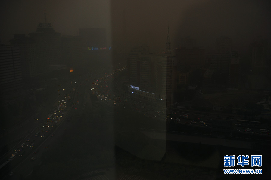 2015年4月15日17时许,北京遭遇沙尘暴袭击,城区能见度降低。图为北京西便门桥附近场景。新华网 李清摄