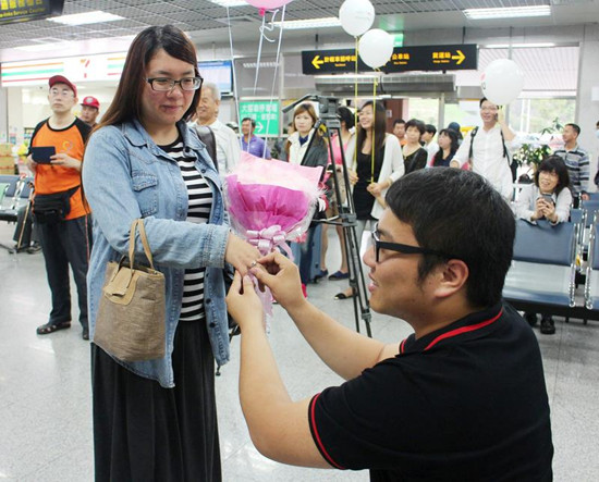 中新网5月29日电 据台湾“中央社”报道,金门文创商品“风伯烧”的老板王家进,28日在机场捧着白色花菜,向交往5年的女友郭佑侦求婚。