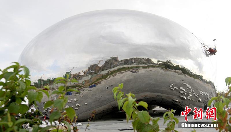 施工人员正在对“大油泡”外观进行抛光打磨作业。 周建玲 摄