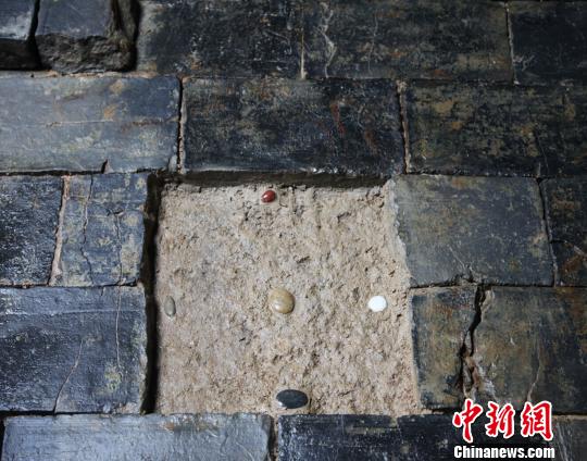 此外,在棺床中部,还发现了一个金井,呈正方形,边长40厘米,深6厘米,中间摆放着五种颜色的鹅卵石,其中,黑、红、青、白四色分别放置于金井的北、南、东、西四个方向,中间一颗为黄色,体积略大于其它四颗,这样的“五色石阵”意义何在,要等待史学专家的解释。