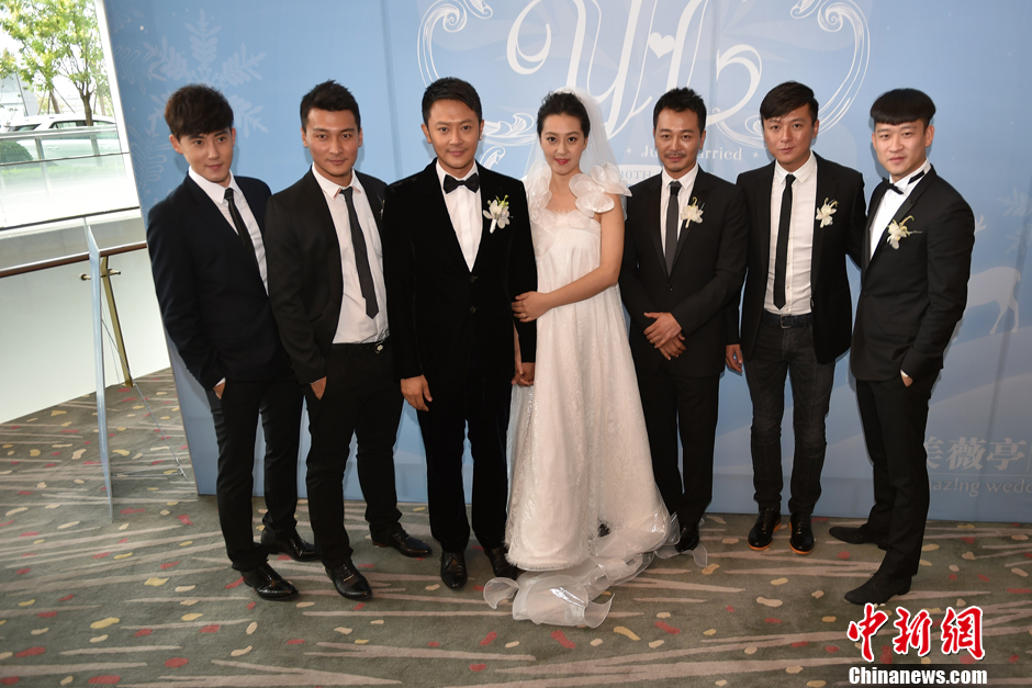 9月10日,印小天与妻子哈琳娜在北京举行婚礼,新娘哈琳娜身着宽松婚纱掩孕肚,新郎印小天穿着西装笔挺帅气。当日婚礼现场,伴郎团由圈中相处多年的朱雨辰、曹云金、贺刚、吴樾、张睿组成,印小天还在现场宣布娇妻已经怀孕,预产期为16年2月。图为伴郎团和新人集体亮相。(右起曹云金、朱雨辰、吴樾、哈琳娜、印小天、贺刚、张睿)中新网记者 金硕 摄