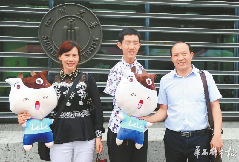 9月12日,四川大学江安校区,彭超和父母在校园门口合影。