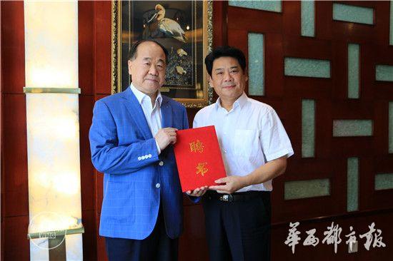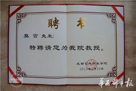 “莫言先生,特聘您为成都艺术学院的教授,邀请您来成都,跟我们的学生讲学。”9月12日中午,北京,成都艺术职业学院院长余开元非常高兴,他亲手将聘书交到了莫言手中,诚聘他为成艺的教授。