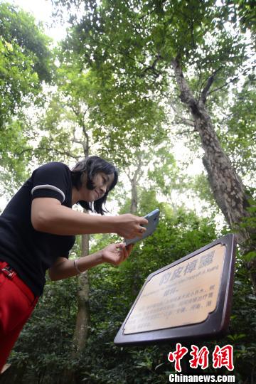 9月15日,在湖南郴州三合村古树群内,游客在用手机扫描树牌上的二维码。 谭志文 摄
