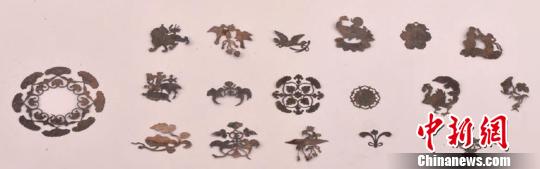 墓中出土的漆盒银箔花饰。 资料图 摄