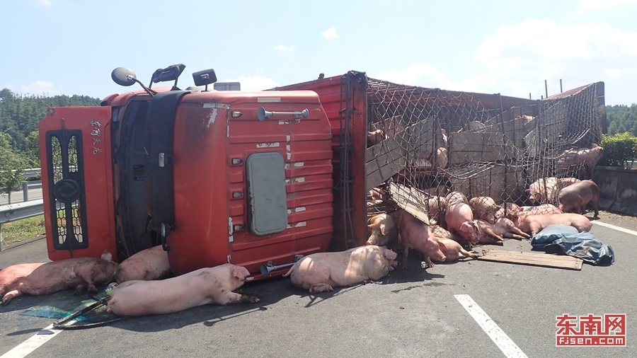 9月16日上午11时许,京台高速南平浦城段(南平往浦城方向)1590公里800米处,一辆满载150余头生猪的豫G号牌的重型特殊结构货车与一辆闽A号牌的现代轿车发生追尾碰撞,在紧急避让轿车的过程中,运猪车发生侧翻,40余头生猪在高速路上乱窜。