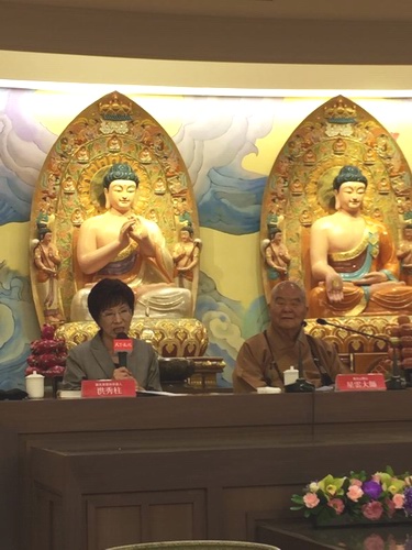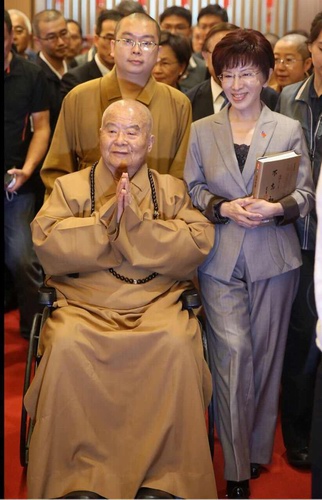 中国网(文化中国)讯:9月21日,台湾佛光山开山宗长星云大师最新亲笔著作《星云智慧》新书发布会在佛光山台北道场举行,星云大师特别北上,亲临开示。国民党台湾地区领导人参选人洪秀柱女士会前先与星云大师会面,扶着星云大师的轮椅一同进场并同台就坐。星云大师发表讲话力挺洪秀柱,这次代表国民党出来竞选2016,在党代会上获得大家支持,“你在我们的心目中,已经当选台湾地区领导人了”。对于洪秀柱曾经说要做“观世音,要救苦救难”,星云大师表示“这一句话是伟大的,我感到非常的赞叹,非常的欢喜”、“妈祖婆是观世音的弟子”。星云大师同时呼吁,希望台湾和中华文化能够接线,让台湾永远与中华文化在一起,都成为佛教的信仰,让信仰成为我们的力量。随后,洪秀柱在致辞时表示,她非常高兴能受邀出席,并得到星云大师的亲笔签名,自己“何其有幸,非常有福气”,也谨记大师所说的“三好”、“四给”、“五和”。