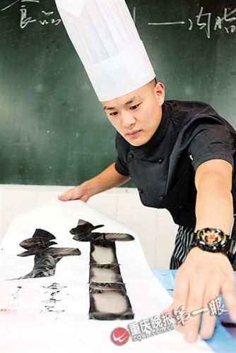 涂建川告诉重庆晚报记者,他是在父亲的影响下开始喜欢书画的,毕业后,到学校担任烹饪教练。涂建川说,去年7月份他开始使用菜刀进行创作,现在,最多5分钟就能写一个字。不仅如此,他还能够使用大葱等其他工具来书写。