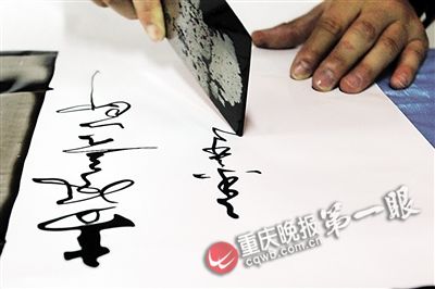 一把菜刀、一盆墨水,将纸放在平整的桌子上,写字前用菜刀先在盆中搅一下,仅让墨水吸附在菜刀三分之一的位置,然后手握菜刀,缓急有序地在纸上进行写作。片刻,一个硕大而坚挺有力的“竹”字就出现在重庆晚报记者面前,重庆晚报记者看到,这个“竹”字,每笔每划上都有细致的花纹,有些像使用菜刀切割的肉片,而“竹”字中的一竖,竹节赫然在目,看起来像幅水墨画。