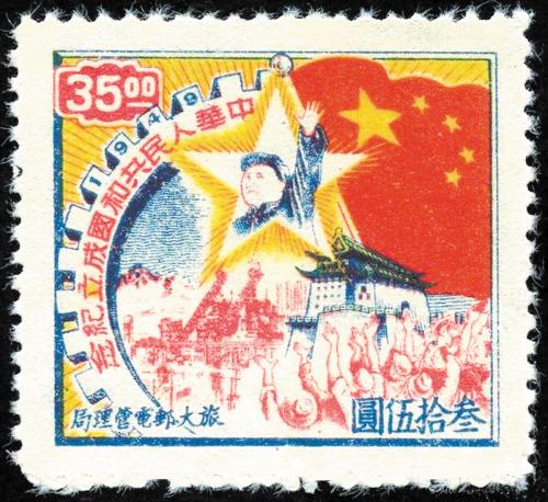 1949年10月1日,中华人民共和国成立,由于历史条件限制,国家邮政没有及时发行建国纪念邮票。当年11月1日,东北解放区的旅大邮电管理局发行了《中华人民共和国成立纪念》一套邮票,这是新中国成立后发行最早的国庆题材邮票。
