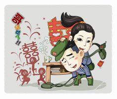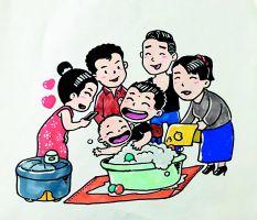 永军和媳妇是高中同学,媳妇是他们班里最好看的姑娘,性格也特别好。当时,永军就在心里默默放下狠话,将来一定要让她出现在自己笔下的全家福中。就这样,经历了八年爱情长跑的他们幸福地步入了婚姻的殿堂。从民政局领证回来后,激动的永军将每年春节的传统项目画全家福提前了,连夜就奋笔疾书画了起来。那张全家福里,披着大红花的他背着漂亮的媳妇,笑得格外灿烂,而爸妈和弟弟则化身威风锣鼓队成员,又是敲锣又是打鼓,好不热闹。
