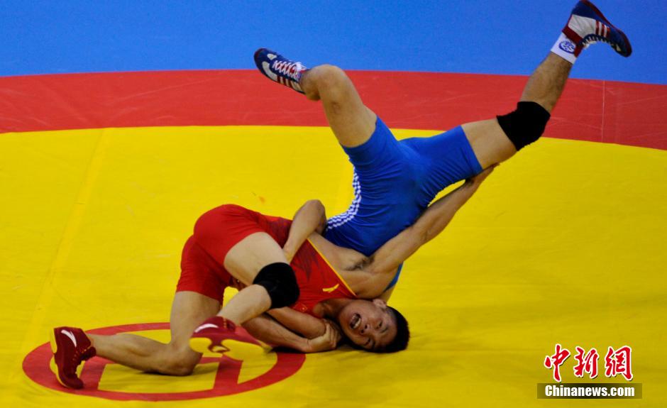 上图为青运会国际式摔跤男子自由式60公斤级决赛中,宁波市队选手袁绍华战胜呼和浩特市队选手海日,夺得冠军。 中新社记者 刘可耕 摄