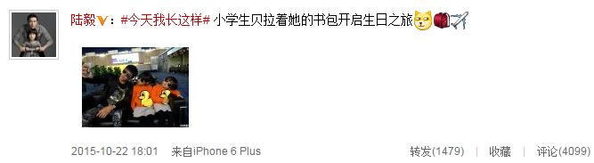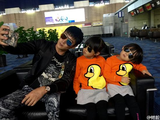 中新网10月22日电 今日,陆毅在微博晒出与两个女儿在机场的合照,并称:“小学生贝拉着她的书包开启生日之旅。”照片中,三人都戴着墨镜,陆毅穿着黑色外套,造型酷炫,两个女儿则穿着橘黄色卡通上衣,十分可爱。另一张中,贝儿还冲着爸爸陆毅伸舌头,很是顽皮。