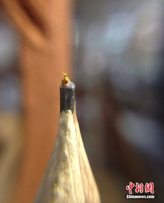 站立在直径0.2公分HB铅笔芯上的小猴子显得渺小,它的表情姿态生动、活泼,小猴子上昂的尾巴,高兴手中捧着粉红色寿桃,显得其乐融融、满足自在,很难让人想到小猴子尺寸只有1毫米,就像砂粒般。