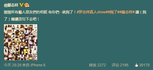 罗志祥在微博写道:“谢谢所有艺人朋友们的相挺,有你们 就够了!让(够了)继续造句下去吧!”
