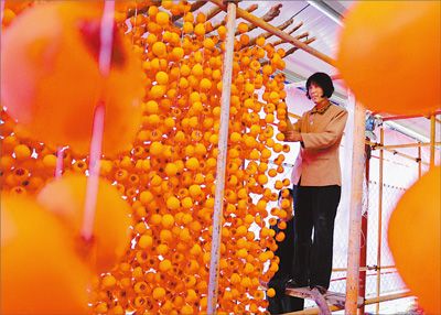 10月25日,山东省沂源县东里镇郑家旺村的农民在对柿子进行刮皮加工。霜降过后,沂源县的5万余亩柿子丰收,加工成柿饼后,出口韩国、日本等国家,成为当地农民增收的特色产业。