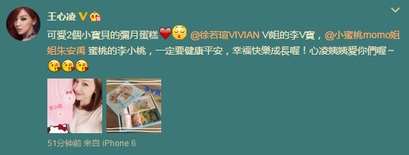 王心凌在微博写道:“可爱2个小宝贝的弥月(满月)蛋糕,徐若瑄的李V宝,朱安禹的李小桃,一定要健康平安,幸福快乐成长喔!心凌姨姨爱你们喔。”