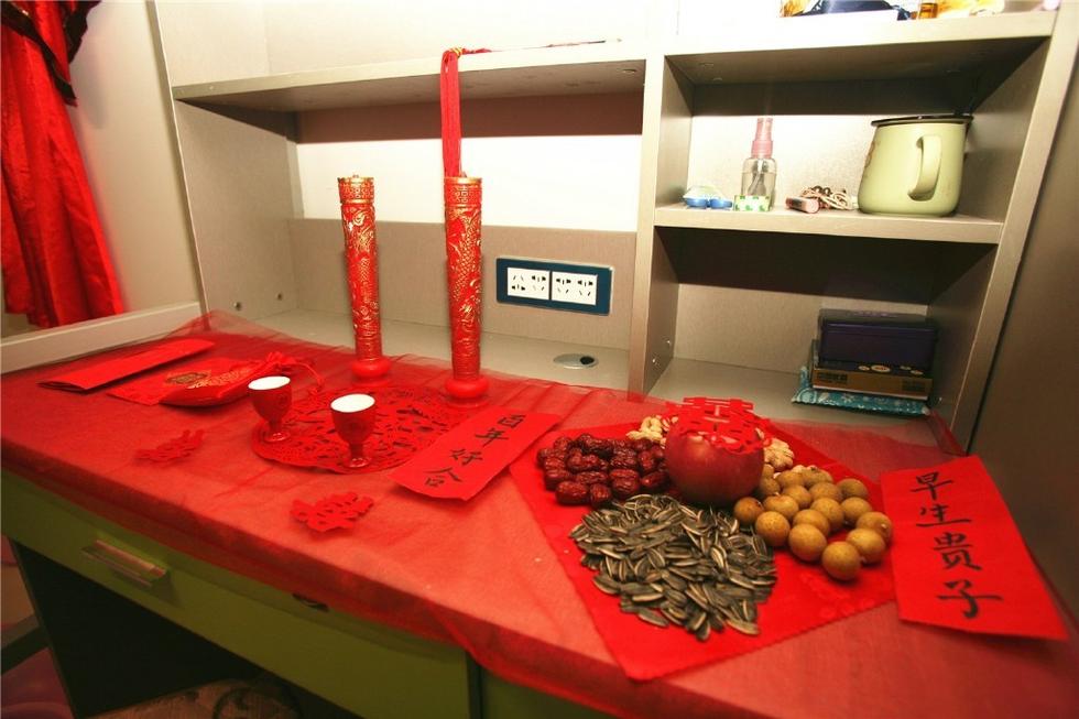 昨天“光棍节”,天津南开大学津南校区的几名女生别出心裁,将“闺房”布置成“婚房”,打造起了“结婚”主题宿舍。