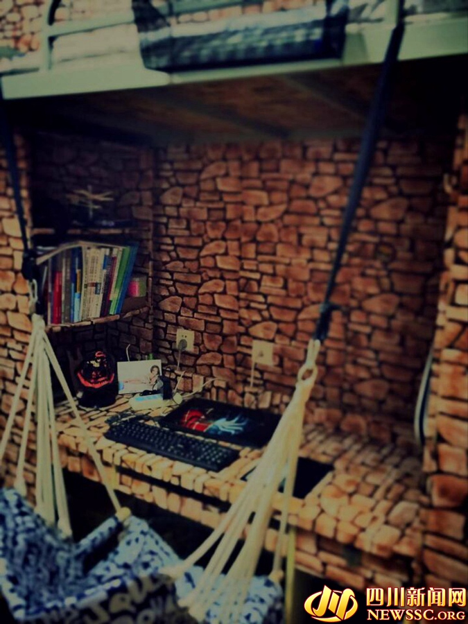 乡村砖瓦墙纸贴满四壁、天花板上画着3D施工图案、板凳被吊椅替换……近日,四川大学锦城学院大一新生李雨壕与三位室友共同打造的“最炫土木风”宿舍走红网络。据了解,从墙纸、吊椅、地毯到摆放的动漫玩具,四位男生仅花费千元人民币,不少装修物品由他们在批发市场买来或手工制作。
