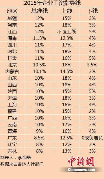 随着广东省工资指导线的出炉,据中新网记者不完全统计,截至11月24日,全国共有北京、天津、山东、山西、陕西、内蒙古、新疆、四川、福建、青海、上海、河南、河北、辽宁、江西、海南、广西、云南、吉林、甘肃、广东等21个省份公布了2015年企业工资指导线。