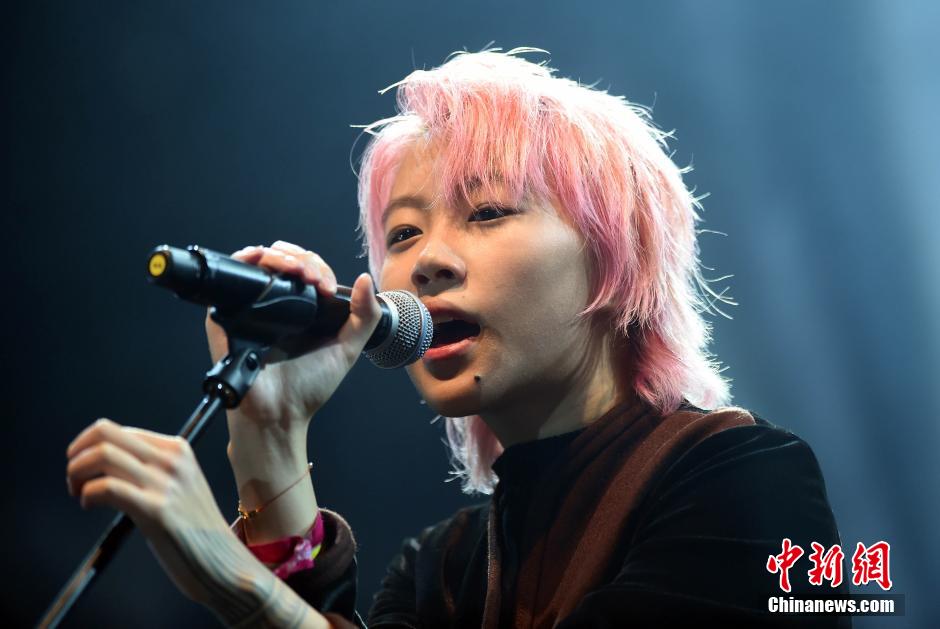 11月28日,窦靖童在香港进行首个公开演出。当日,一头粉红色头发的窦靖童以中性打扮现身,出席香港音乐节及艺术节演出。中新社记者 张宇 摄