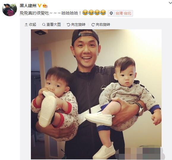 腾讯娱乐讯(文/嬷嬷)12月14日晚,黑人陈建州在微博晒出抱着一对双胞胎儿子的照片,并配文称:“飞飞真的很爱吃~~~哈哈哈哈!”照片中,飞飞抱着自己的脚并啃着自己的鞋,而翔翔则一脸呆萌看着镜头。