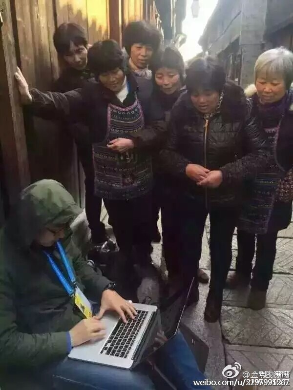 记者在第二届世界互联网大会举办地乌镇采访完后正在赶稿,无意中被一群大妈围观了。同行的小伙伴随手记录下了这个画面。