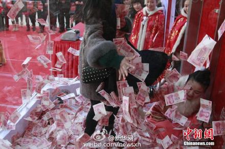 杭州景区给游客发奖 百万大钞满天飞
