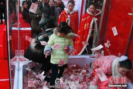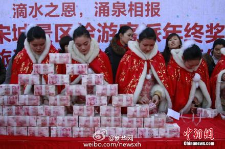 26日,杭州宋城景区给游客派发年终奖。主办方通过微信征集十位景区游客,在特定区域内限时一分钟,能抓多少带走多少。最高一位来自衢州的陆小姐抓到18300元,成为当天抓到最多年终奖的游客。据悉,当天现场现金共有五百万元。