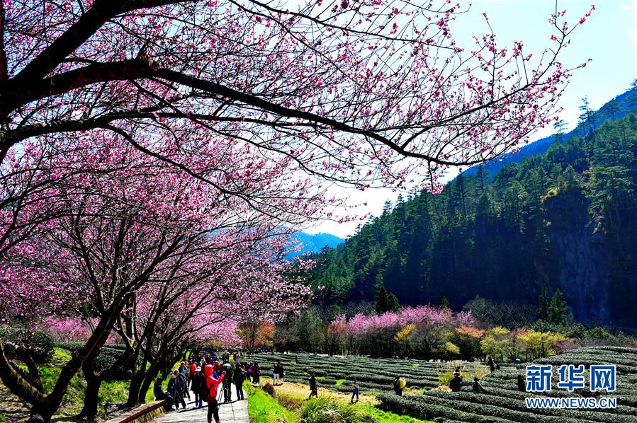 2月29日,游客在武陵农场茶园观赏樱花。初春的台湾,气温回升,位于海拔1700多米的台中武陵农场,漫山遍野的樱花竞相开放,美不胜收,吸引了四面八方的游客前来观赏。 新华社记者张国俊 摄