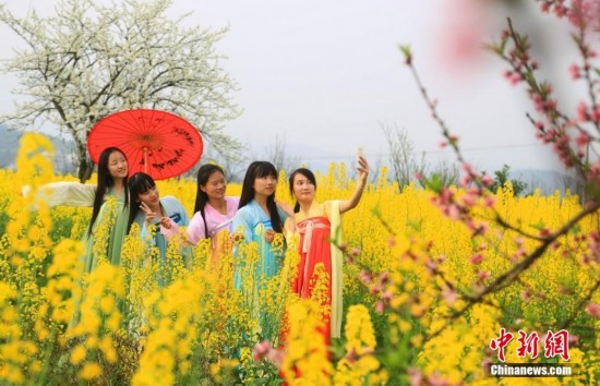 3月7日是“女生节”,湖南南华大学的汉服爱好者们在桃花园中上演了一场“汉服秀”,以此弘扬中国汉服文化。曹正平 摄