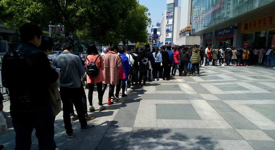 3月28日,浙江省金华市,金华部分黄金经营商家推出优惠折扣,特别推出和猴年有关的黄金产品。当低价优惠来临,不少市民果断出手,在街头排起了长队购买黄金。