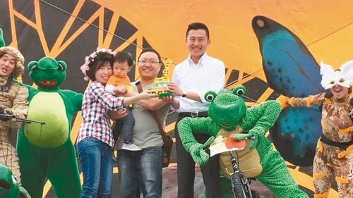 伊索动物园4月4日喜迎第10万名访客李先生一家,市长林智坚(右)赠送长颈鹿乐高与脚踏车。来源:台湾《联合报》