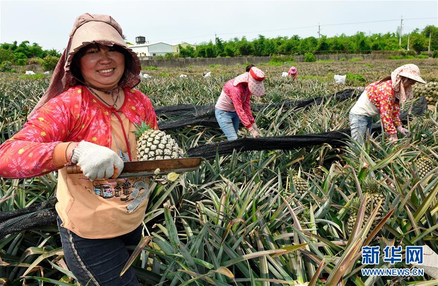 4月10日,嘉义县大林镇果农在采摘凤梨。日前,台湾凤梨进入盛产期,果农正在大量采收上市。凤梨种植是台湾农业的支柱产业,也是台湾三大名果之一,台湾凤梨以其果形好、甜度高、香味浓郁深受市场欢迎。新华社记者 张国俊 摄