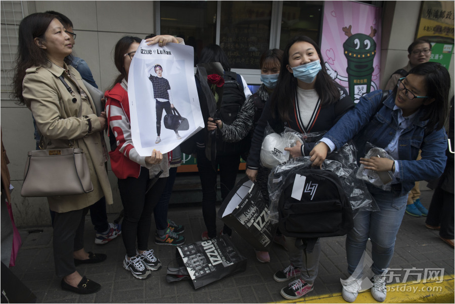 随着上午九点发售时间的临近,年轻的粉丝们陆续赶来。她们中不少人手里还提着昨夜通在南京西路宵排队买来的2千多元的鹿晗联名版的书包、帽子等全套时尚潮品。