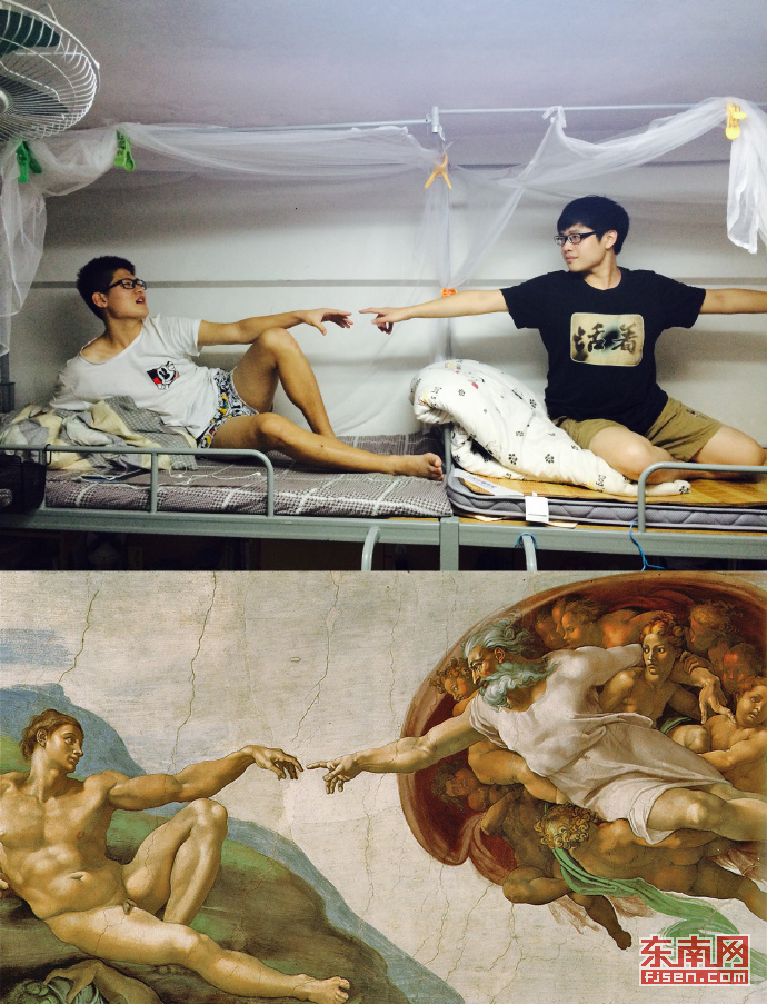《最后的晚餐》、《创造亚当》、《美国哥特式》……一张张真人扮演的“世界名画”,到位的动作、惟妙惟肖的神情,让人忍俊不禁。据了解,该组照片由福建医科大学大三学子刘博扬所摄,辅导员、舍友、同学等人都成了他照片中的模特。