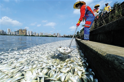 5月4日早上,海口市红城湖湖面沿岸漂浮着大量死鱼,有40名环卫工人从早上7时许开始在现场打捞,截止上午10时许,已经打捞了八、九吨死鱼。