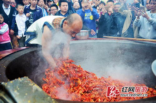 红网张家界5月8日讯(时刻新闻记者 姚冶 通讯员 吴勇兵)快入夏了,一只只鲜红油亮的麻辣龙虾总是牵动着人们的味蕾。吃小龙虾常见,但在直径2米、油温110℃以上的大油锅中徒手爆炒龙虾,可算是奇事了。